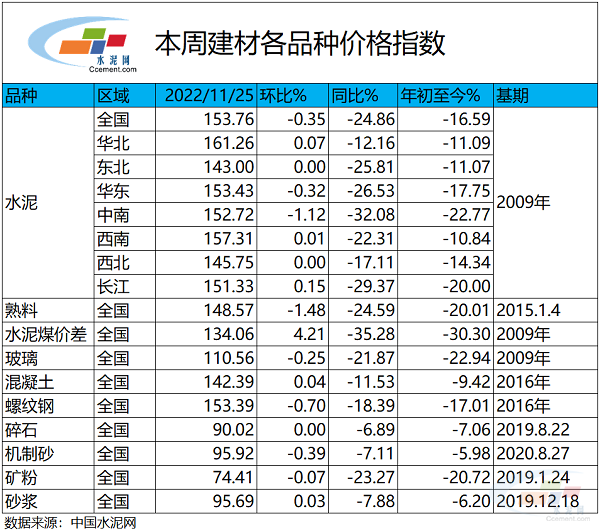本周五,全國水泥價格指數(shù)為153.76點,環(huán)比下跌0.35%,同比下跌24.86%;熟料價格指數(shù)為148.57點,環(huán)比下跌1.48%,同比下跌24.59%;水泥煤價差指數(shù)為134.06點,環(huán)比上漲4.21%,同比下跌35.28%;玻璃價格指數(shù)為110.56點,環(huán)比下跌0.25%,同比下跌21.87%;混凝土指數(shù)為142.39點,環(huán)比上漲0.04%,同比下跌11.53%;螺紋鋼價格指數(shù)為153.39點,環(huán)比下跌0.70%,同比下跌18.39%;碎石價格指數(shù)為90.02點,環(huán)比持平,同比下跌6.89%;機制砂價格指數(shù)為95.92點,環(huán)比下跌0.39%,同比下跌7.11%;礦粉價格指數(shù)為74.41點,環(huán)比下跌0.07%,同比下跌23.27%;砂漿價格指數(shù)為95.69點,環(huán)比上漲0.03%,同比下跌7.88%。
